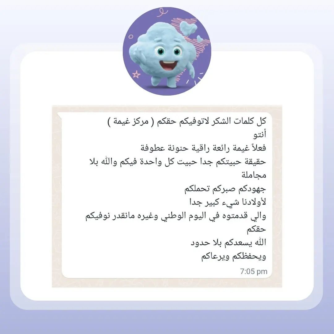 غيمة هي المساحة الآمنة لكل طفل ليستكشف فيها نفسه يتعلم، يبدع ويستمتع بين أعلى معايير المهنية والجودة والسلامة.. في غيمة.. ستكون دائما مطمئنًا على طفلك
